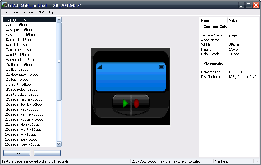 - некоторые текстуры абсолютно идентичны на iOS, Android и Galaxy (например, hud.txd или fonts.txd);
