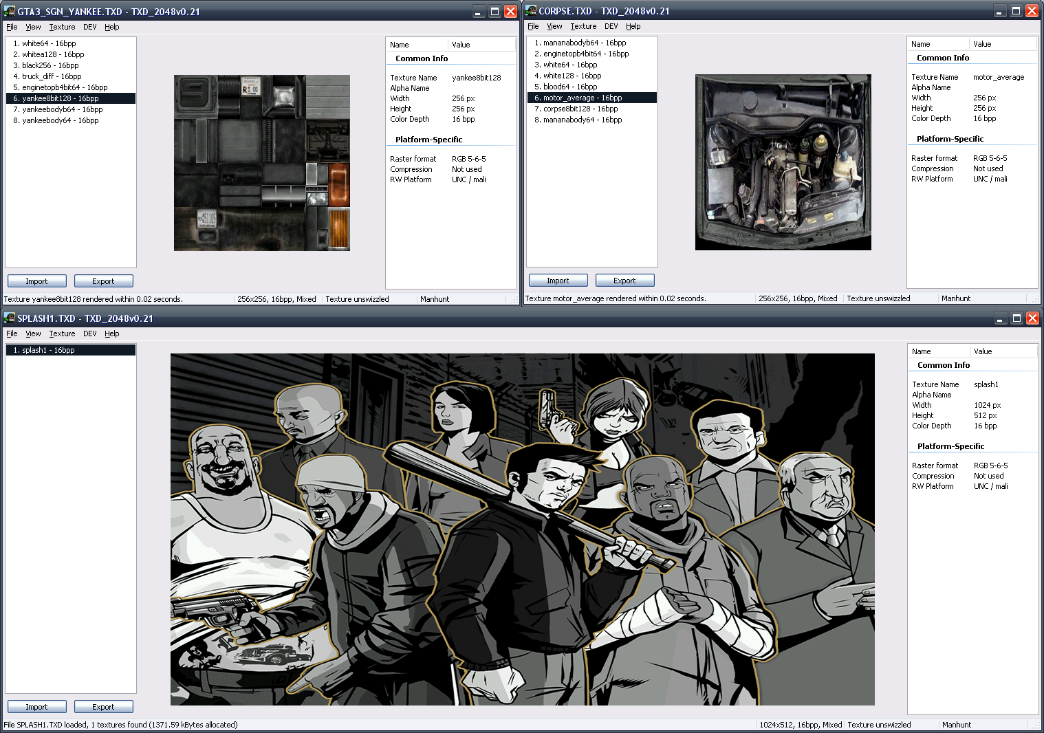 3) 12-ый формат самый интересный, поскольку текстуры попадаются вообще непонятно вида и, в то же время, самый простой формат, который я умею открывать.